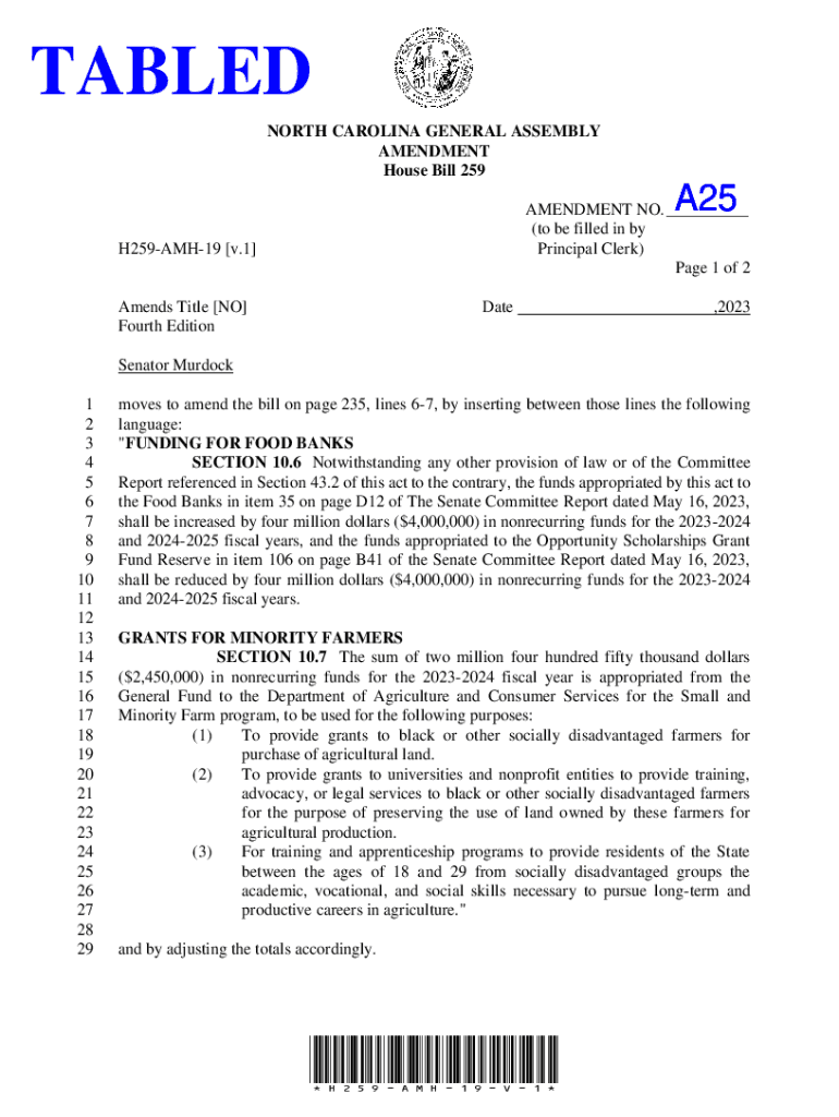 TABLED NORTH CAROLINA GENERAL ASSEMBLY AMENDMENT House Bill 259A25 A25AMENDMENT NO. ___ (to be filled in by Principal Clerk) Page 1 of 2H259AMH19 [v.1]Amends Title [NO] Fourth EditionDate,2023Senator