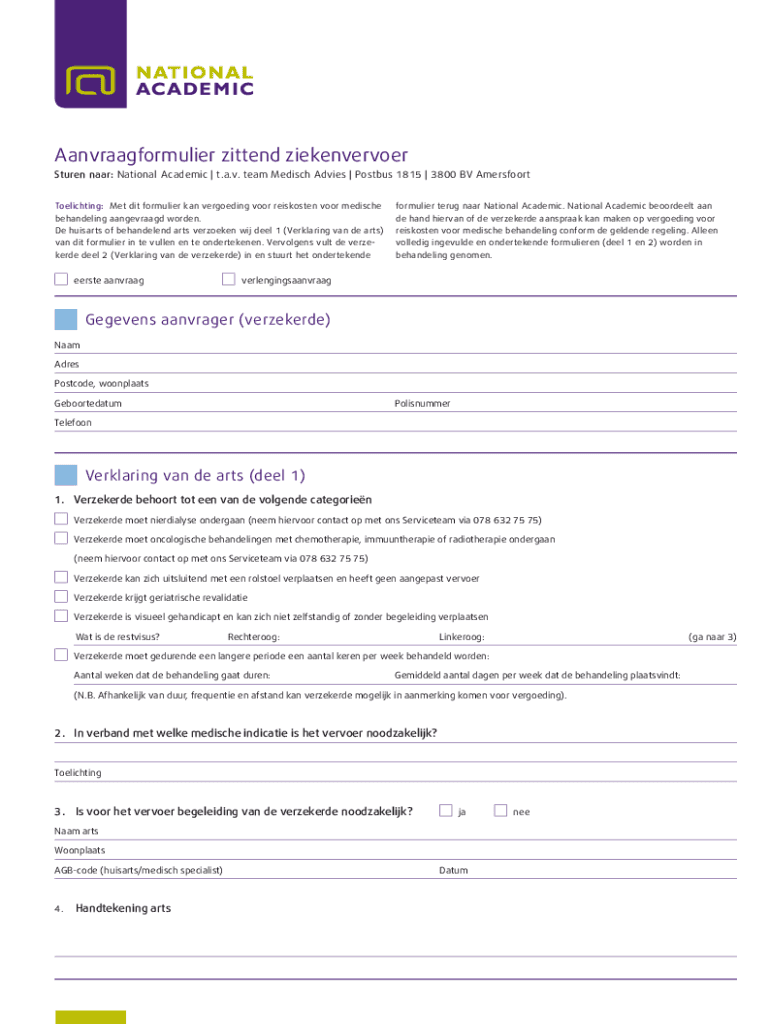 Aanvraagformulier zit tend ziekenvervoerSturen near: National Academic | t.a.v. team Medici Advise | Postbus 1815 | 3800 BV Amersfoort