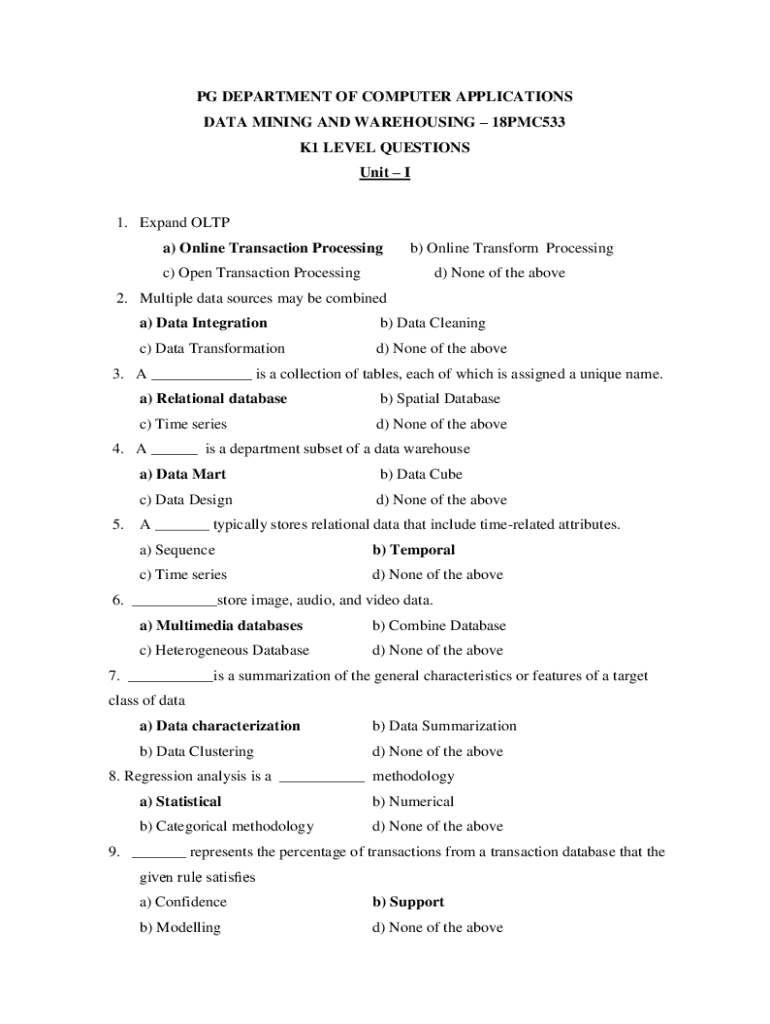 PG DEPARTMENT OF COMPUTER APPLICATIONS DATA MINING AND WAREHOUSING 18PMC533 K1 LEVEL QUESTIONS Unit I 1. Expand OLTP a) Online Transaction Processing) Online Transform Processing) Open Transaction