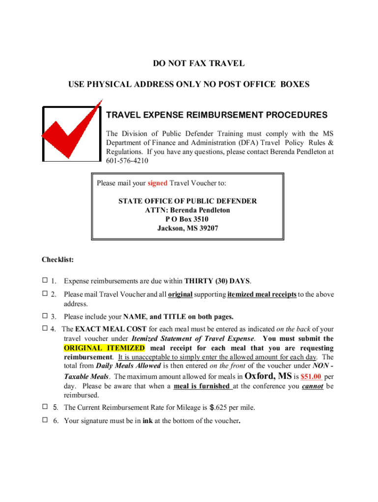 DO NOT FAX TRAVEL USE PHYSICAL ADDRESS ONLY NO POST OFFICE BOXESTRAVEL EXPENSE REIMBURSEMENT PROCEDURES The Division of Public Defender Training must comply with the MS Department of Finance and Administration