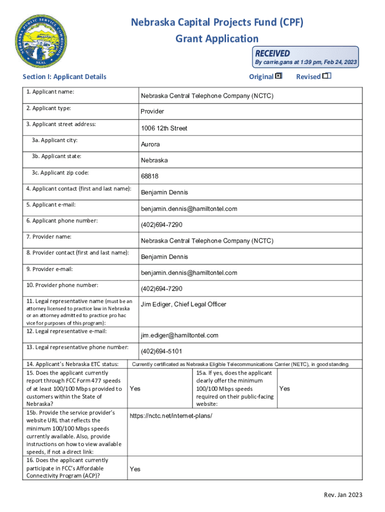 Nebraska Capital Projects Fund (CPF) Grant Application By carry. Fans at 1:39 pm, Feb 24, 2023Section I: Applicant DetailsOriginal 1. Applicant name:Nebraska Central Telephone Company (CTC)2. Applicant