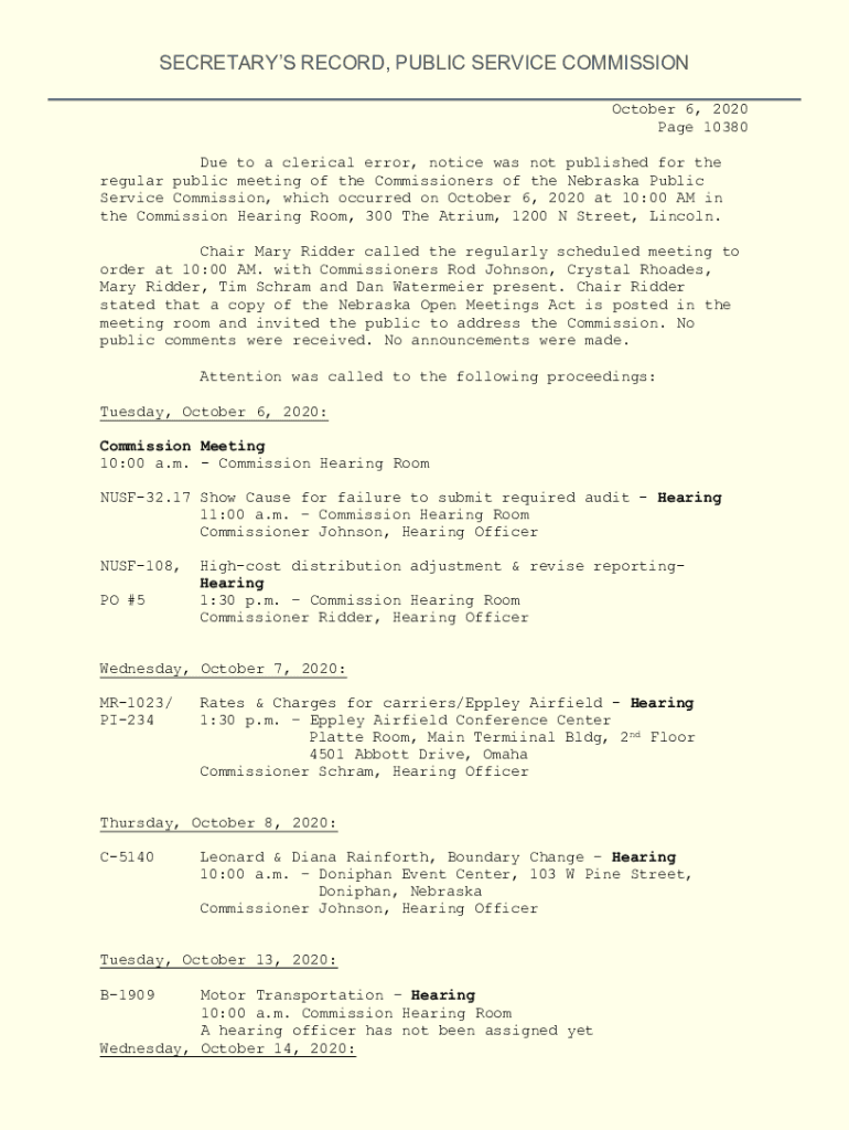SECRETARY RECORD, PUBLIC SERVICE COMMISSION October 6, 2020-Page 10380 Due to a clerical error, notice was not published for the regular public meeting of the Commissioners of the Nebraska Public