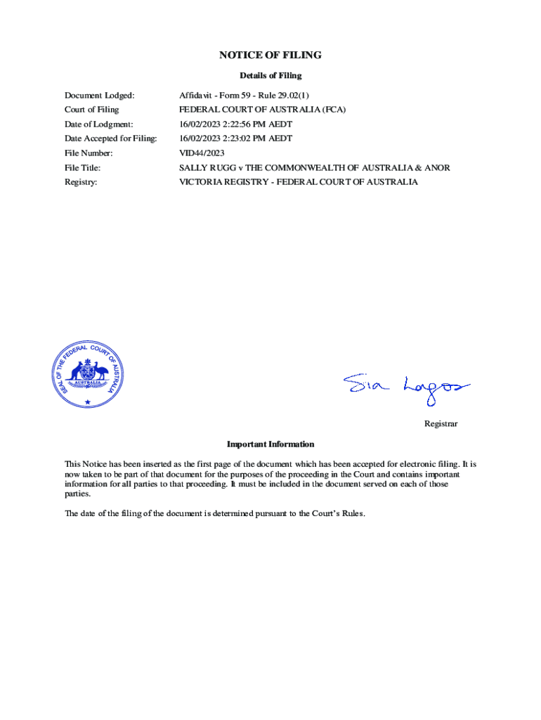 NOTICE OF FILING Details of Filing Document Lodged:Affidavit Form 59 Rule 29.02(1)Court of FilingFEDERAL COURT OF AUSTRALIA (FCA)Date of Judgment:16/02/2023 2:22:56 PM Candidate Accepted for Filing:16/02/2023