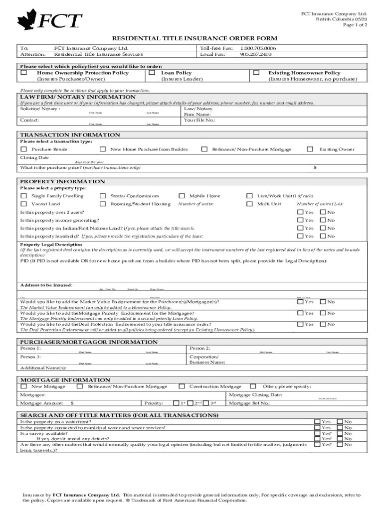ACT Insurance Company Ltd. British Columbia 05/20-Page 1 of 2RESIDENTIAL TITLE INSURANCE ORDER FORM To: Attention:ACT Insurance Company Ltd. Residential Title Insurance ServicesTollfree Fax: Local