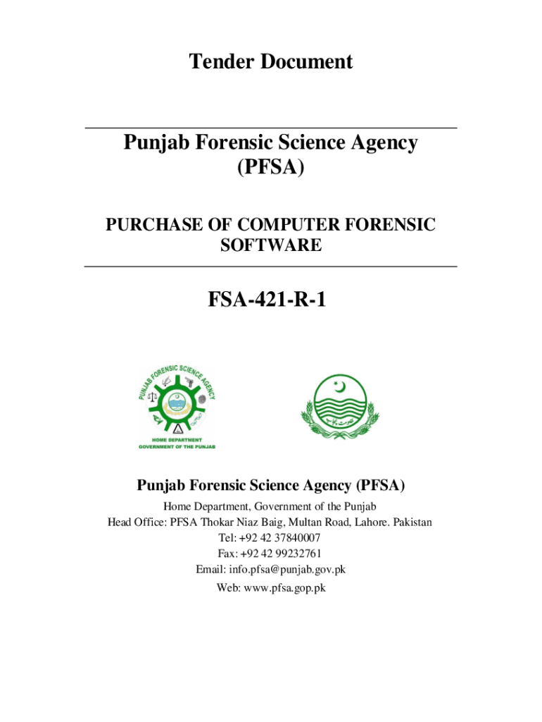 Tender Document Punjab Forensic Science Agency (PSA) PURCHASE OF COMPUTER FORENSIC SOFTWAREFSA421R1Punjab Forensic Science Agency (PSA) Home Department, Government of the Punjab Head Office: PSA Thomas