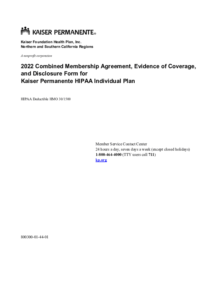 Kaiser Foundation Health Plan, Inc. Northern and Southern California Regions A nonprofit corporation2022 Combined Membership Agreement, Evidence of Coverage, and Disclosure Form for Kaiser Permanent