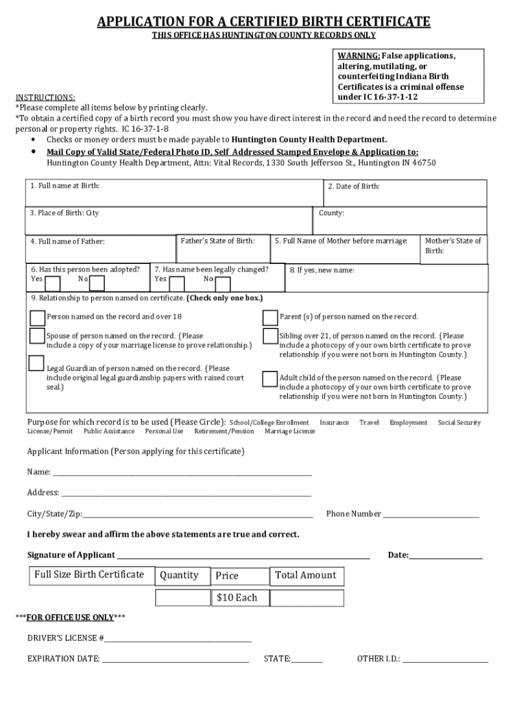 APPLICATION FOR A CERTIFIED BIRTH CERTIFICATE THIS OFFICE HAS HUNTINGTON COUNTY RECORDS ONLY WARNING: False applications, altering, mutilating, or counterfeiting Indiana Birth Certificates is a criminal
