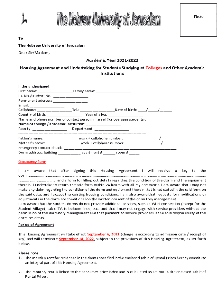 Photo The Hebrew University of Jerusalem Dear Sir/Madam, Academic Year 20212022 Housing Agreement and Undertaking for Students Studying at Colleges and Other Academic Institutions I, the undersigned,