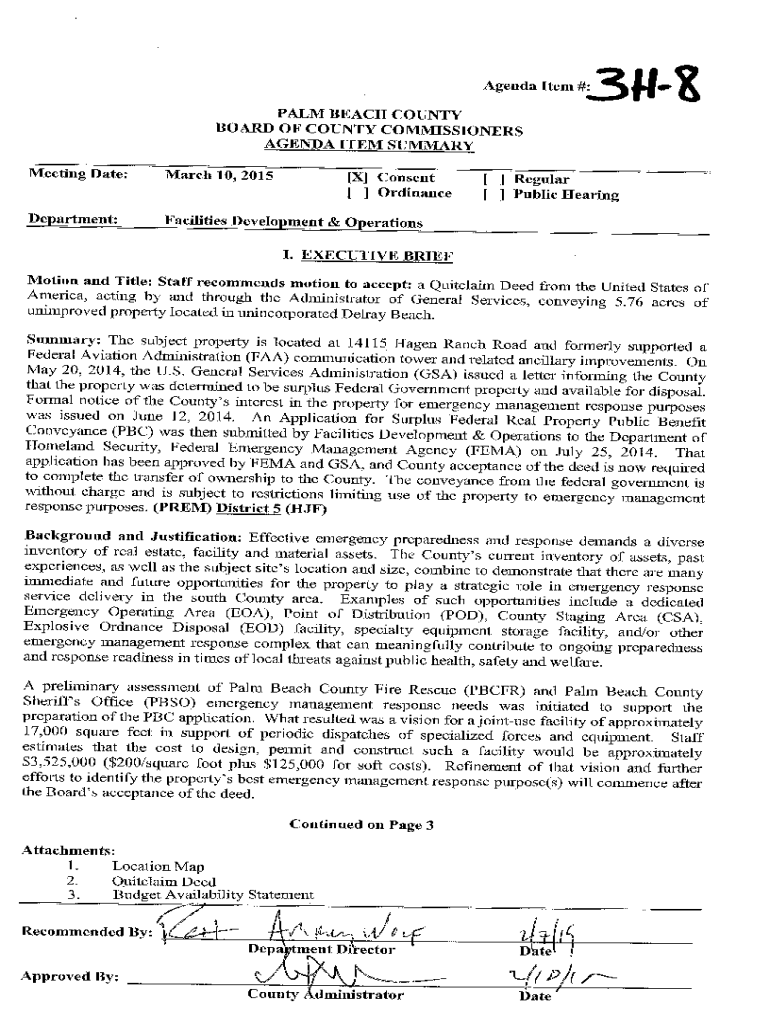PALM BEACH COUNTY BOARD OF COIN TY COMMISSIONERS AGENDA ITEM SUMMARY Meeting Date:March 10, 2015Department:Facilities Development & Operations[X] Consent [ ] Ordinance[ ] Regular [ ] Public Hearing.