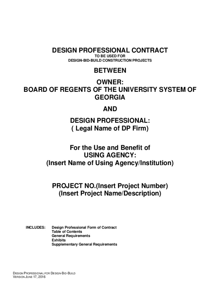 DESIGN PROFESSIONAL CONTRACT TO BE USED FOR DESIGNBIDBUILD CONSTRUCTION PROJECTSBETWEEN OWNER: BOARD OF REGENTS OF THE UNIVERSITY SYSTEM OF GEORGIA AND DESIGN PROFESSIONAL: (Legal Name of DP Firm)