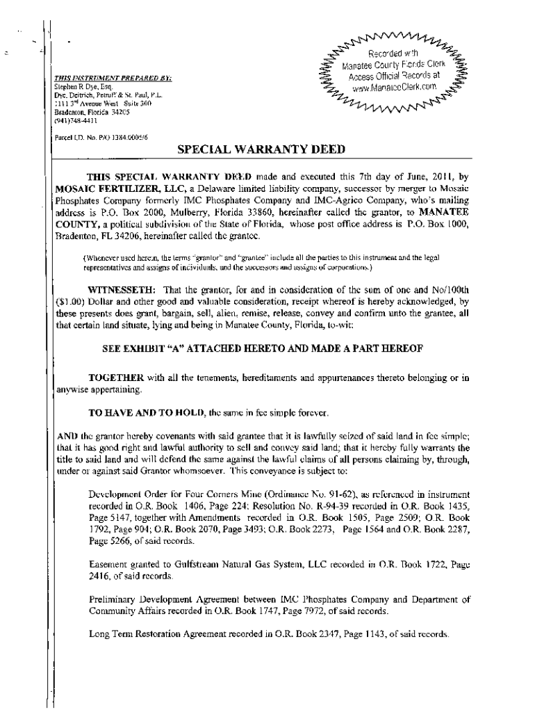 . THIS INSTRUMENT PREPARED BY: Stephen R Dye, Esq. Dye, Dietrich, Pet ruff & St. Paul, P.L. 1111 3\'d Avenue West Suite 300 Bradenton, Florida 34205 (941)7484411 Parcel I.D. No. P/0 1384.0005/6SPECIAL