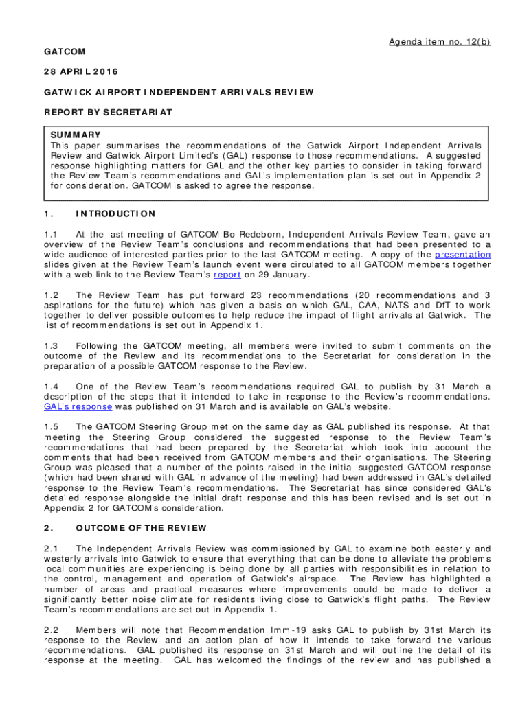 GATCOMAgenda item no. 12(b)28 APRIL 2016 GATWICK AIRPORT INDEPENDENT ARRIVALS REVIEW REPORT BY SECRETARIAT SUMMARY This paper summarizes the recommendations of the Gatwick Airport Independent Arrivals