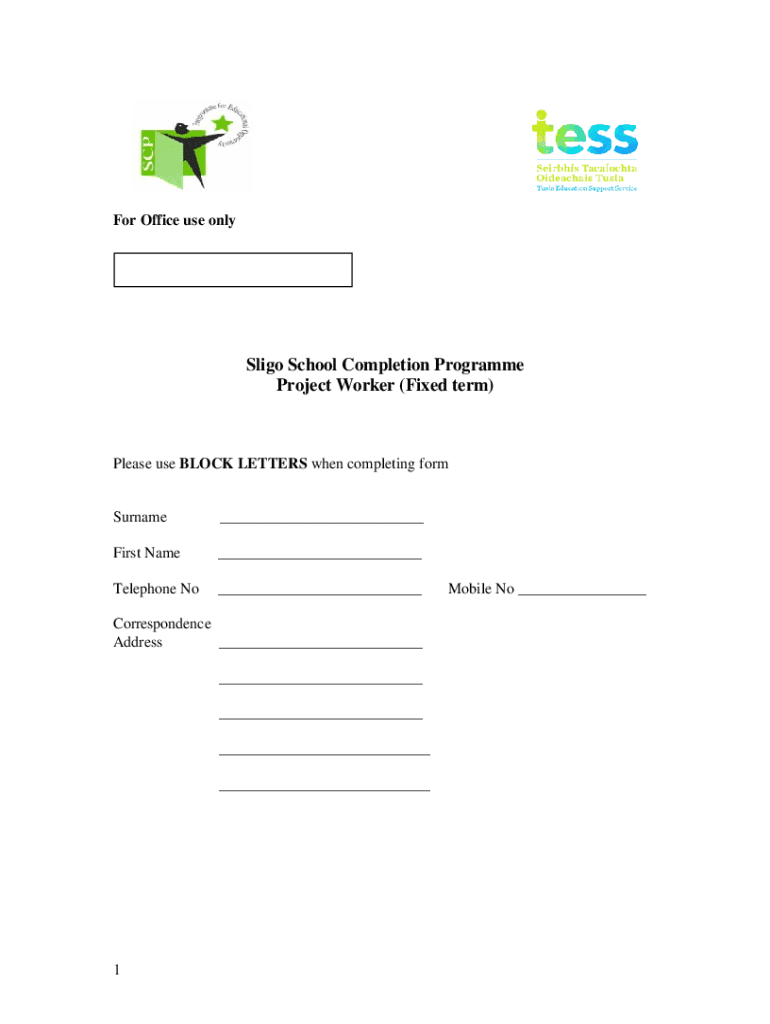 For Office use onlySligo School Completion Program Project Worker (Fixed term)Please use BLOCK LETTERS when completing formSurname___First Name___Telephone No___Correspondence Address ___ ___ ___