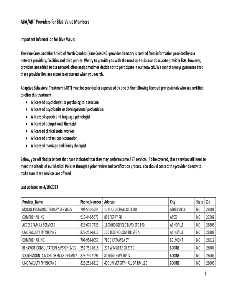 ABA/ABT Providers for Blue Value Members Important Information for Blue Value: The Blue Cross and Blue Shield of North Carolina (Blue Cross NC) provider directory is created from information provided