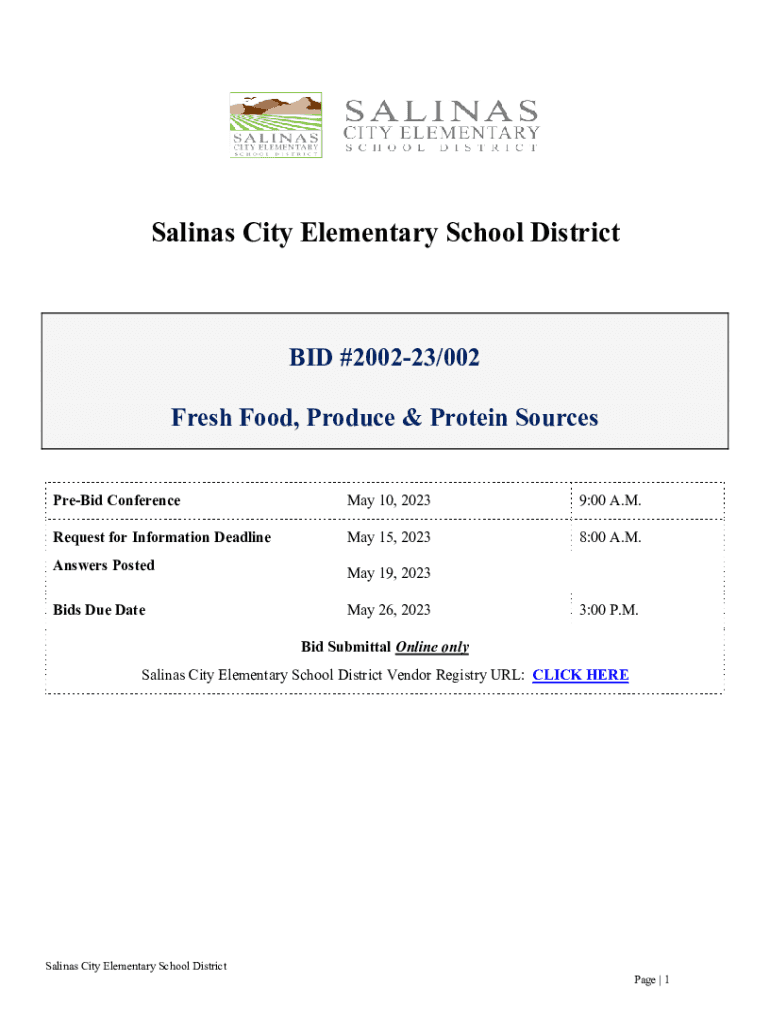 Salinas City Elementary School District BID #200223/002 Fresh Food, Produce & Protein Sources PreBid Conference May 10, 20239:00 A.M. Request for Information Deadline May 15, 20238:00 A.M. Answers