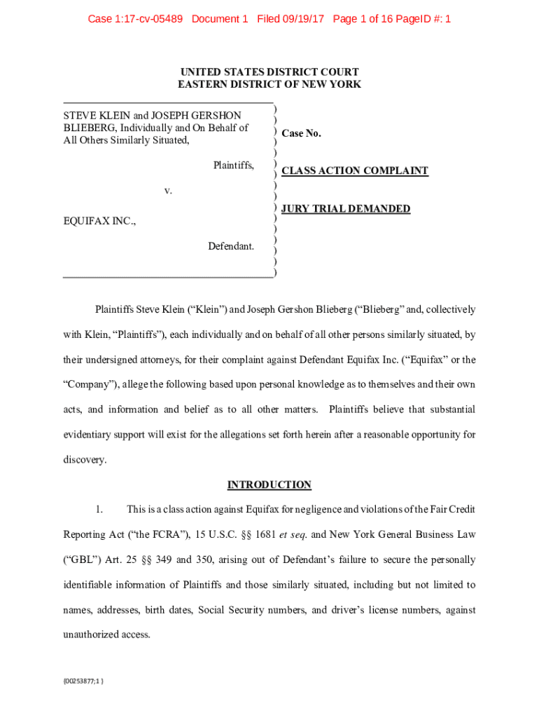 Case 1:17cv05489 Document 1 Filed 09/19/17-Page 1 of 16 Paged #: 1 UNITED STATES DISTRICT COURT EASTERN DISTRICT OF NEW YORK))) Case No. )))) CLASS ACTION COMPLAINT))) JURY TRIAL DEMANDED))))))STEVE