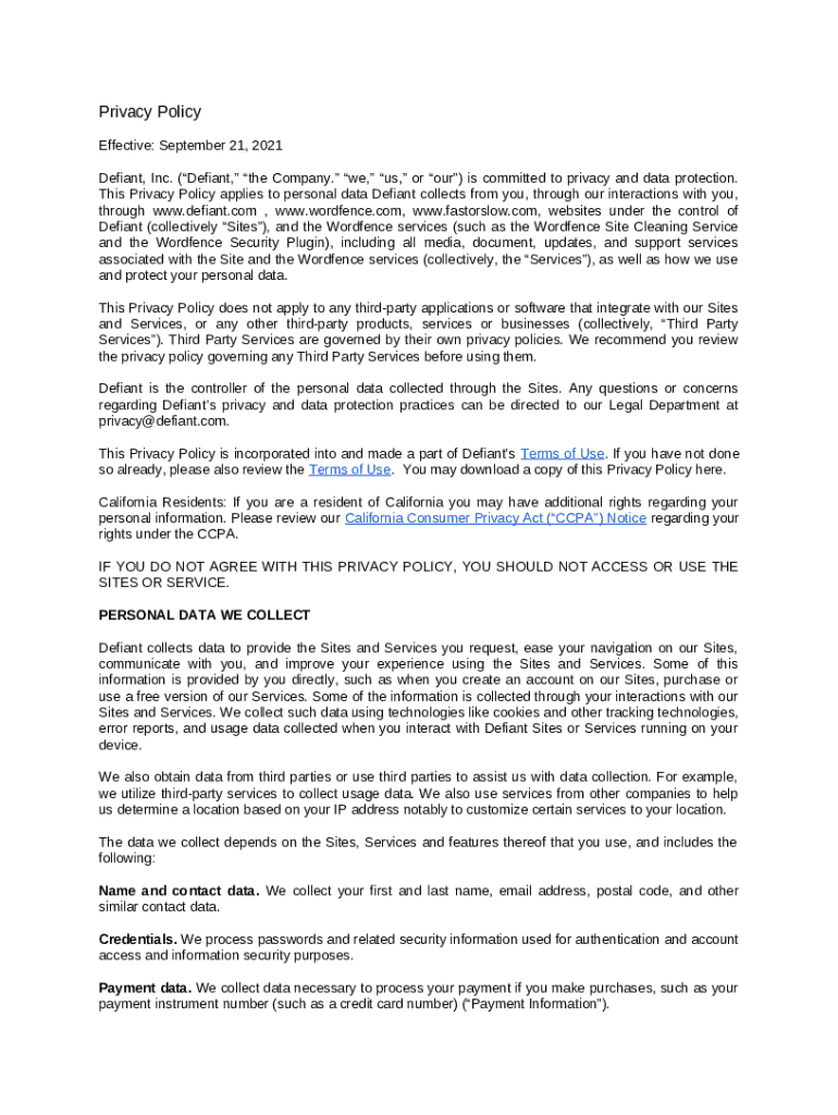 Privacy Policy Effective: September 21, 2021, Defiant, Inc. (Defiant, the Company. We, us, or our) is committed to privacy and data protection. This Privacy Policy applies to personal data Defiant