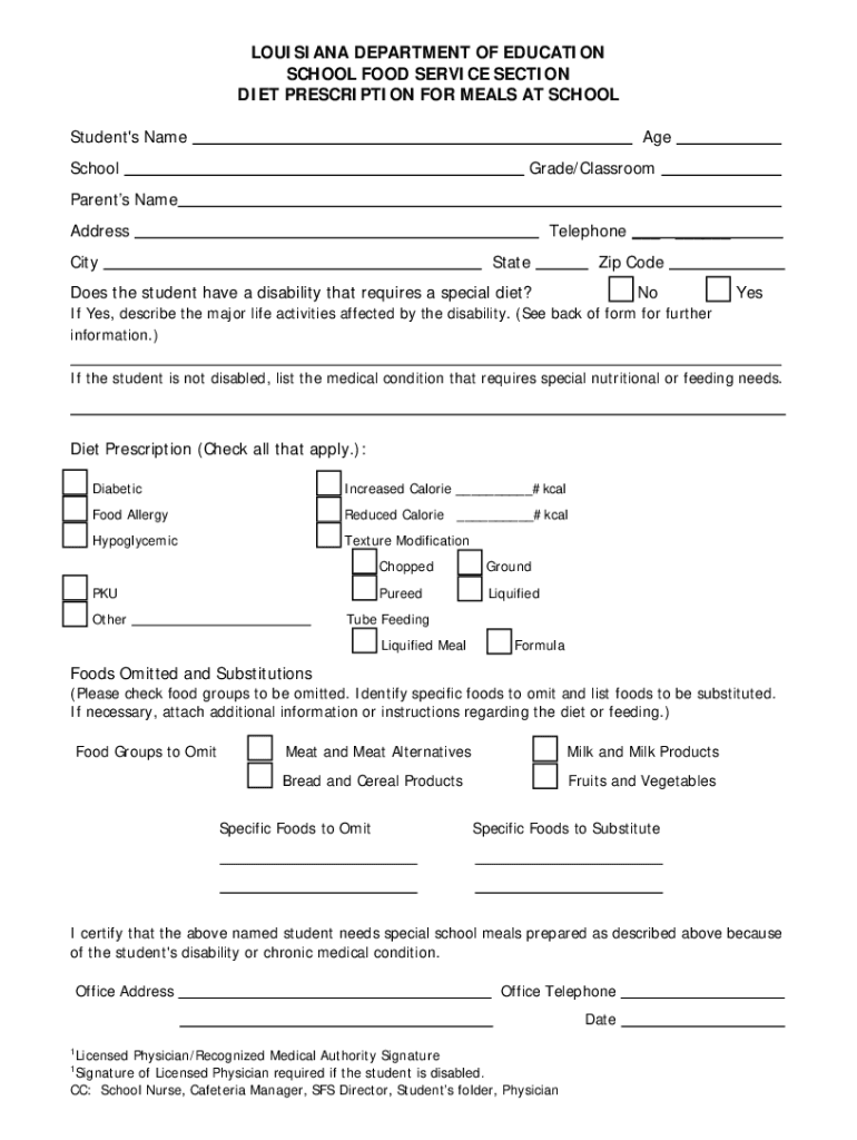 DIET PRESCRIPTION FOR MEALS AT SCHOOL