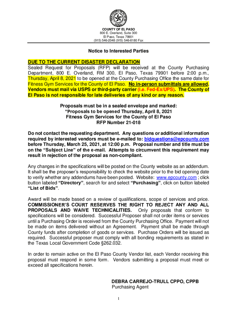 COUNTY OF EL PASO 800 E. Overland, Suite 300 El Paso, Texas 79901 (915) 5462048 (915) 5468180 Notice to Interested Parties DUE TO THE CURRENT DISASTER DECLARATION Sealed Request for Proposals (RFP)