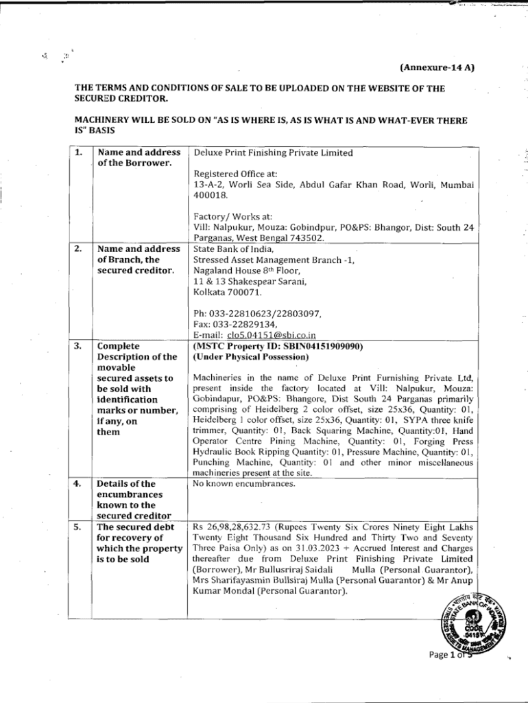 \”* (Annexure14 A) THE TERMS AND CONDITIONS OF SALE TO BE UPLOADED ON THE WEBSITE OF THE SECURED CREDITOR. MACHINERY WILL BE SOLD ON AS IS WHERE IS, AS IS WHAT IS AND WHATEVER THERE IS\” BASIS