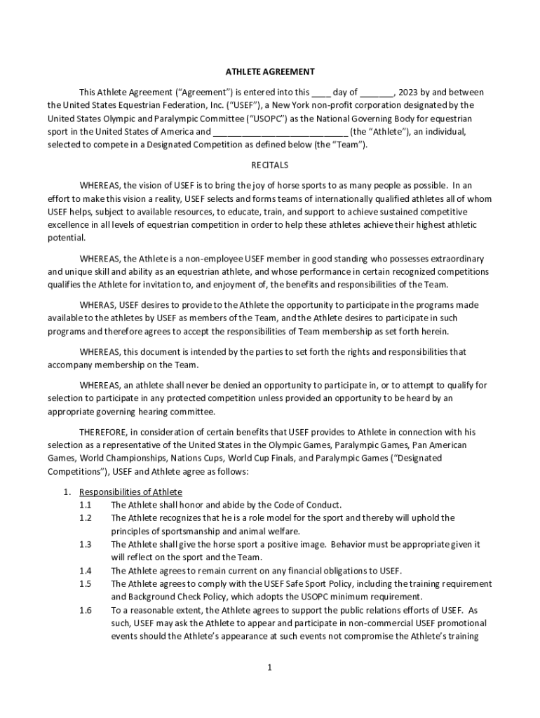 ATHLETE AGREEMENT This Athlete Agreement (Agreement) is entered into this ___ day of ___, 2023 by and between the United States Equestrian Federation, Inc. (USED), a New York nonprofit corporation