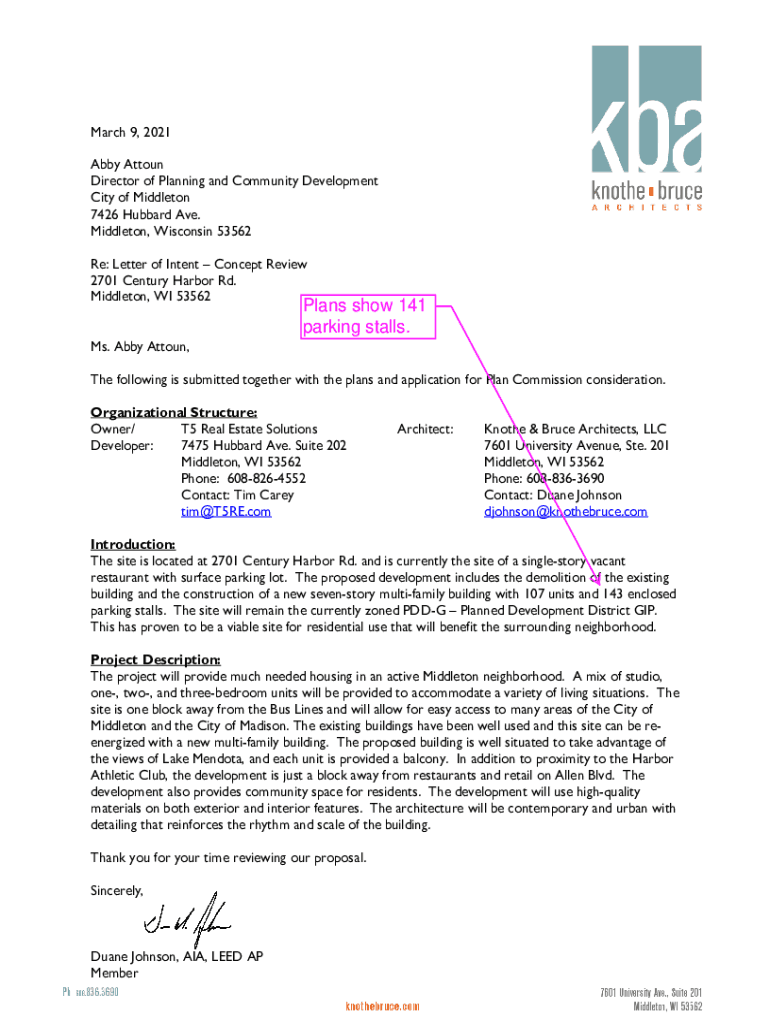 March 9, 2021, Abby Attorn Director of Planning and Community Development City of Middleton 7426 Hubbard Ave. Middleton, Wisconsin 53562 Re: Letter of Intent Concept Review 2701 Century Harbor Rd.