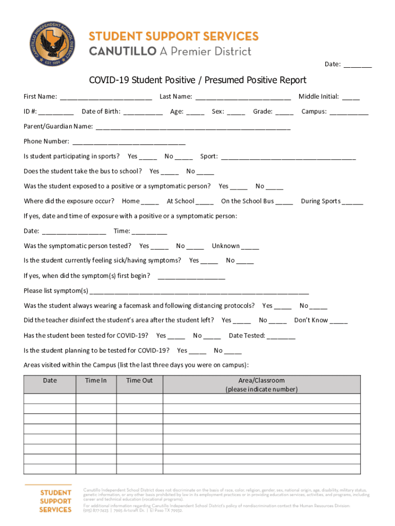 Date: ___COVID-19 Student Positive / Presumed Positive Report First Name: ___ ID #: ___Last Name: ___Date of Birth: ___Age: ___Sex: ___Middle Initial: ___Grade: ___Campus: ___Parent/Guardian Name:
