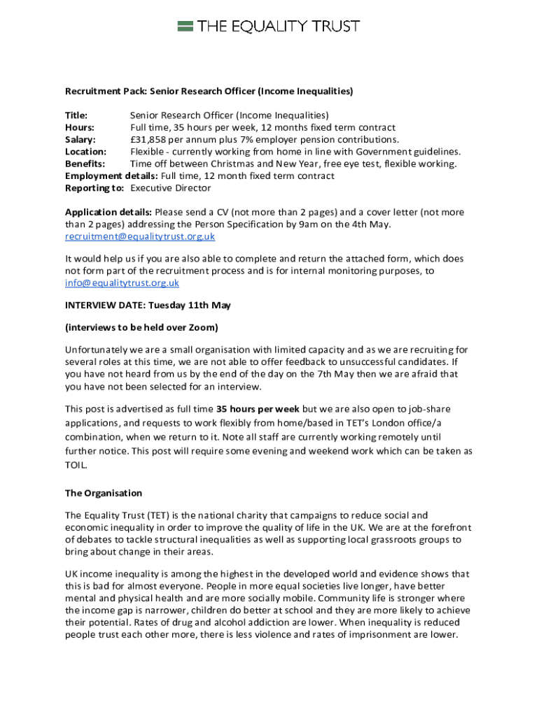 Recruitment Pack: Senior Research Officer (Income Inequalities) Title: Senior Research Officer (Income Inequalities) Hours: Full time, 35 hours per week, 12 months fixed term contract Salary: 31,858