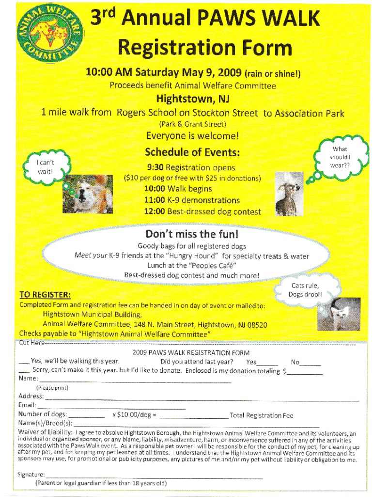 3\'d Annual PAWS WALKRegistration Form 10:00 AM Saturday, May 9,2009 (rain or shine!) Proceeds benefit Animal Welfare Committee Hightstown, NFL mile walk from Rogers School on Stockton Street to Association