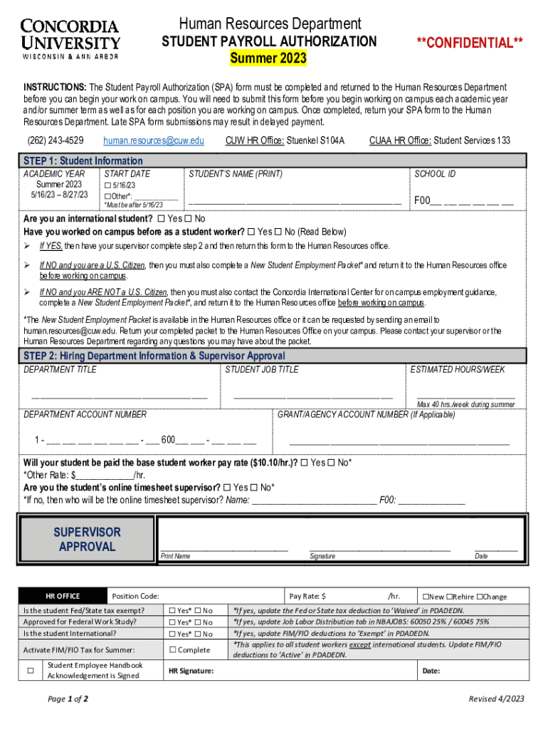 Human Resources Department STUDENT PAYROLL AUTHORIZATION Summer 2023**CONFIDENTIAL**INSTRUCTIONS: The Student Payroll Authorization (SPA) form must be completed and returned to the Human Resources