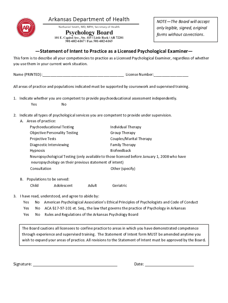 Get the free Statement of Intent to Practice as a Licensed Psychological ... - psychologyboard ar...