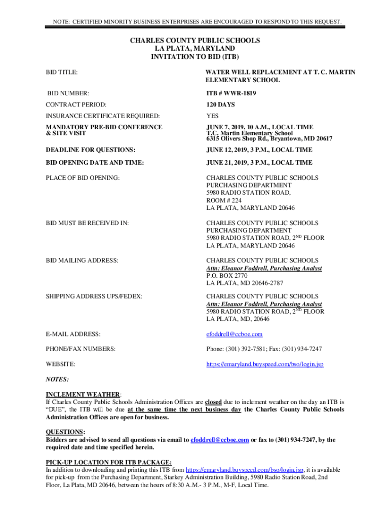 NOTE: CERTIFIED MINORITY BUSINESS ENTERPRISES ARE ENCOURAGED TO RESPOND TO THIS REQUEST.CHARLES COUNTY PUBLIC SCHOOLS LA PLATE, MARYLAND INVITATION TO BID (ITB) BID TITLE:WATER WELL REPLACEMENT AT
