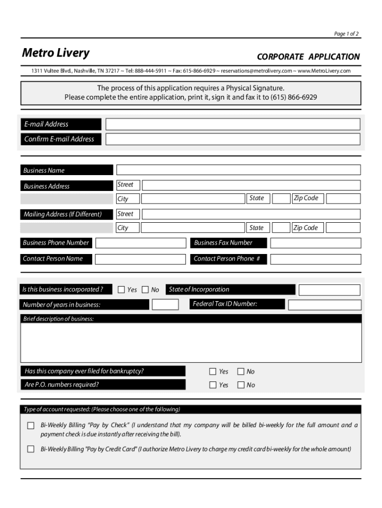 Page 1 of 2Metro LiveryCORPORATE APPLICATION1311 Vaulted Blvd., Nashville, TN 37217 Tel: 8884445911 Fax: 6158666929 reservations@metrolivery.com www.MetroLivery.comThe process of this application