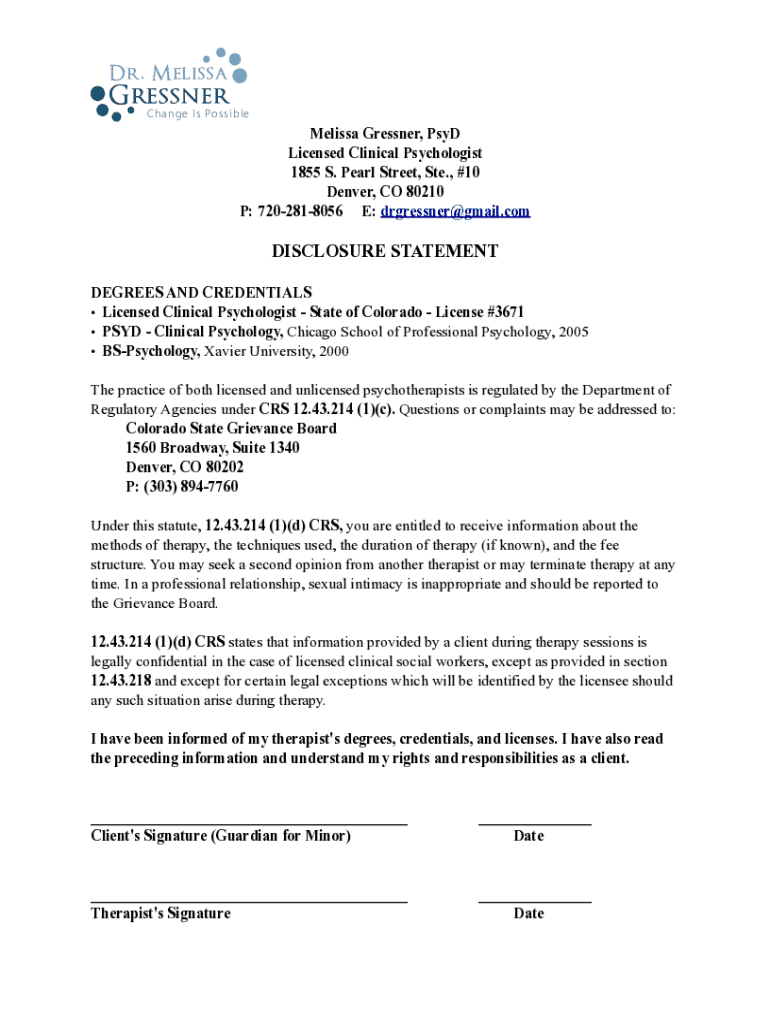 !\”#$%&\'())*+\”&)), &\” Change Is Possible Melissa Dresser, PSD Licensed Clinical Psychologist 1855 S. Pearl Street, Ste., #10 Denver, CO 80210 P: 7202818056 E: drgressner@gmail.comDISCLOSURE