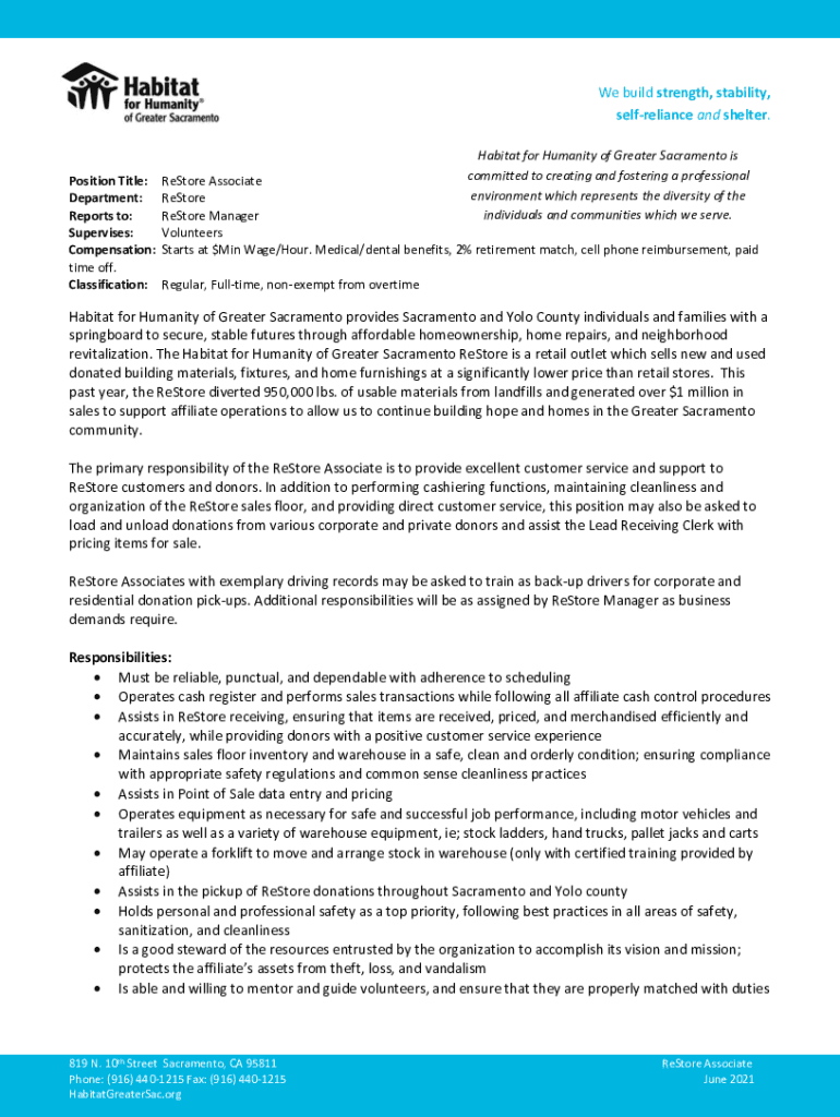 We build strength, stability, self-reliance and shelter. Position Title: Department: Reports to: Supervises: Compensation: time off. Classification:Habitat for Humanity of Greater Sacramento is committed