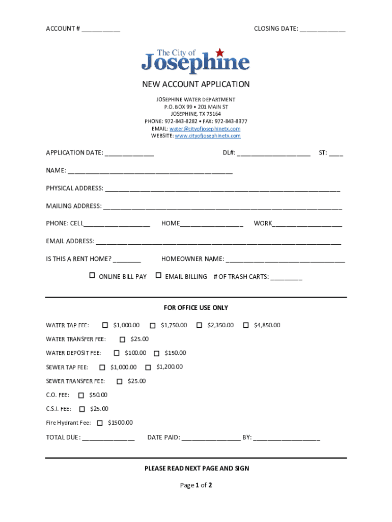 ACCOUNT # ___CLOSING DATE: ___The City one ACCOUNT APPLICATION JOSEPHINE WATER DEPARTMENT P.O. BOX 99 201 MAIN ST JOSEPHINE, TX 75164 PHONE: 9728438282 FAX: 9728438377 EMAIL: water@cityofjosephinetx.com