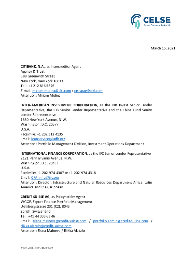 March 15, 2021CITIBANK, N.A., as Intercreditor Agent Agency & Trust 388 Greenwich Street New York, New York 10013 Tel.: +1 212 816 5576 Email: miriam.molina@citi.com / cts.spag@citi.com Attention: