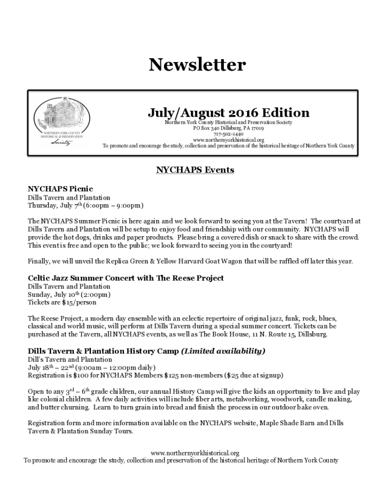 Newsletter July/August 2016 EditionNorthern York County Historical and Preservation Society PO Box 340 Dills burg, PA 17019 7175021440 www.northernyorkhistorical.org To promote and encourage the study,