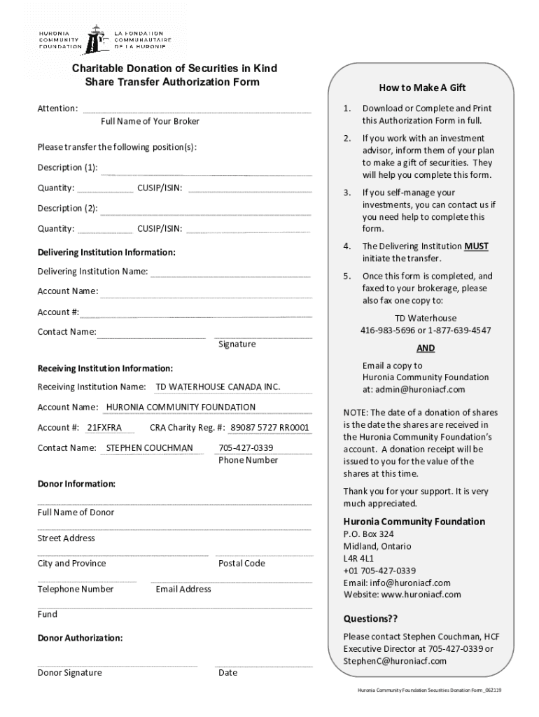 Get the free Securities Donation Form - Huronia Community Foundation