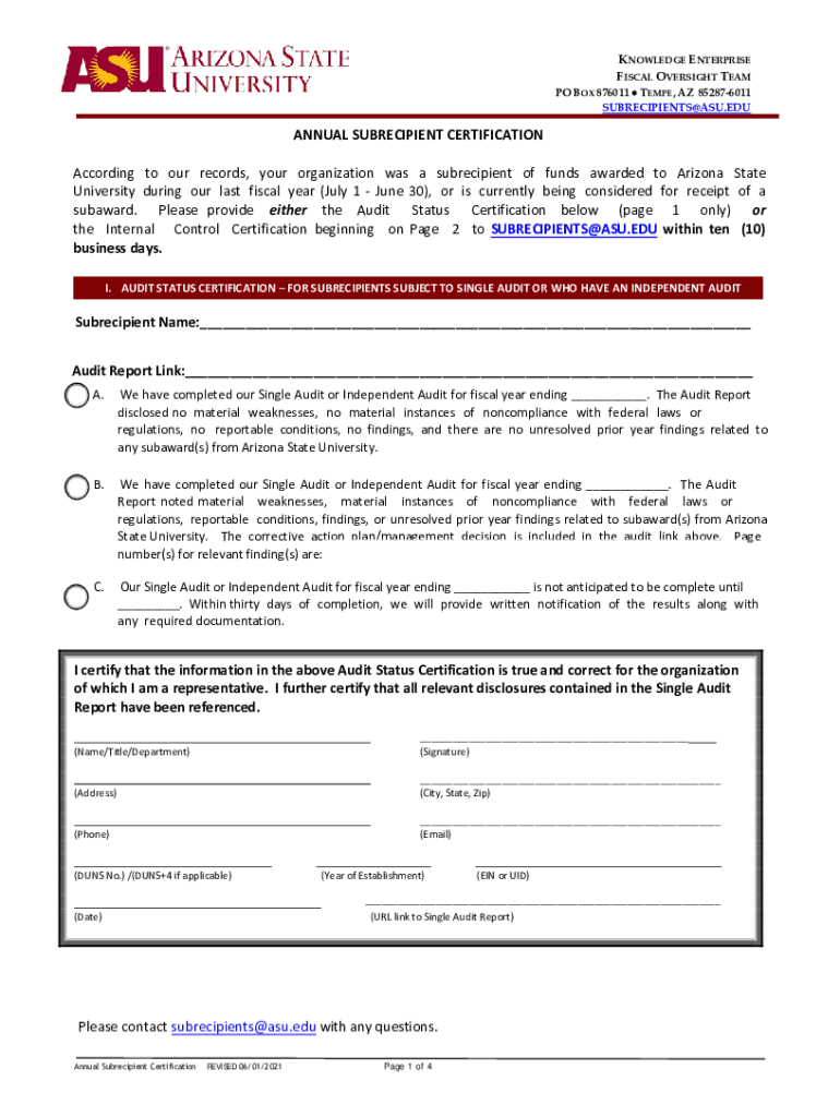 KNOWLEDGE ENTERPRISE FISCAL OVERSIGHT TEAM PO BOX 876011 TEMPE, AZ 852876011 SUBRECIPIENTS@ASU.EDUANNUAL RECIPIENT CERTIFICATION According to our records, your organization was a subrecipient of funds