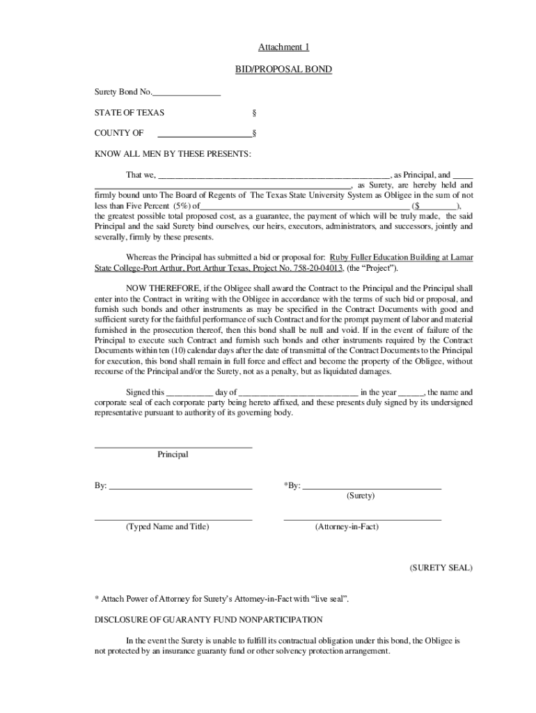 Attachment 1 BID/PROPOSAL BOND Surety Bond No. STATE OF TEXASCOUNTY KNOW ALL MEN BY THESE PRESENTS: That we, ___, as Principal, and, as Surety, are hereby held and firmly bound unto The Board of Regents