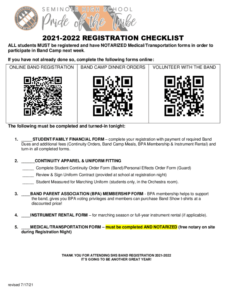 20212022 REGISTRATION CHECKLIST ALL students MUST be registered and have NOTARIZED Medical/Transportation forms in order to participate in Band Camp next week. If you have not already done so, complete