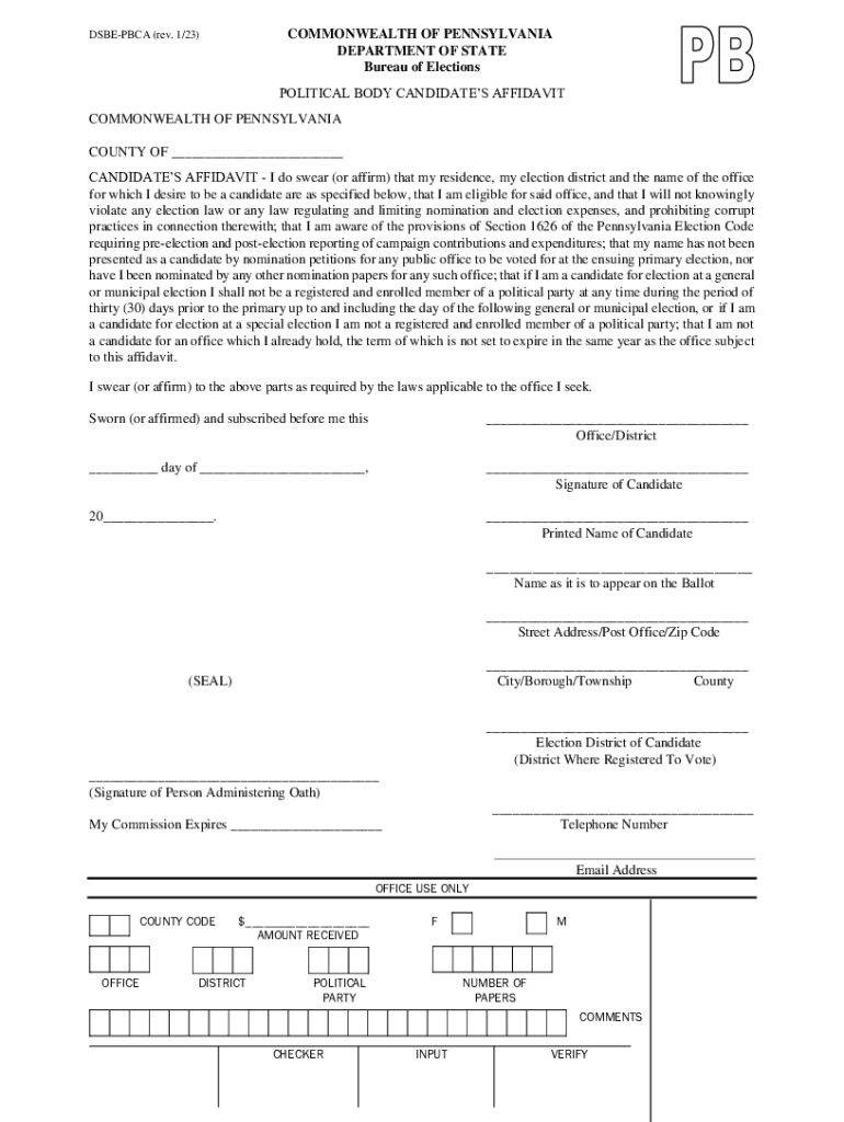 COMMONWEALTH OF PENNSYLVANIA DEPARTMENT OF STATE Bureau of ElectionsDSBEPBCA (rev. 1/23)POLITICAL BODY CANDIDATES AFFIDAVIT COMMONWEALTH OF PENNSYLVANIA COUNTY OF ___ CANDIDATES AFFIDAVIT I do swear