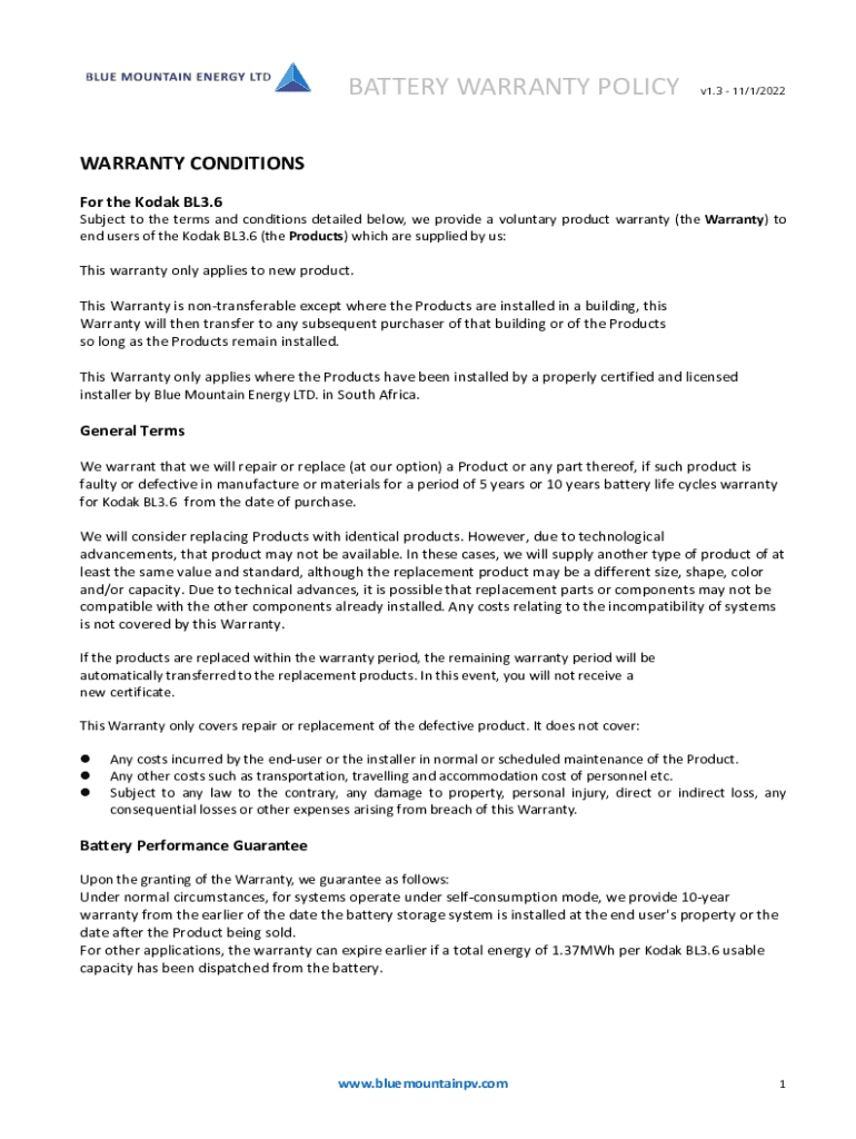 BATTERY WARRANTY POLICYv1.3 11/1/2022WARRANTY CONDITIONS For the Kodak BL3.6Subject to the terms and conditions detailed below, we provide a voluntary product warranty (the Warranty) to end users