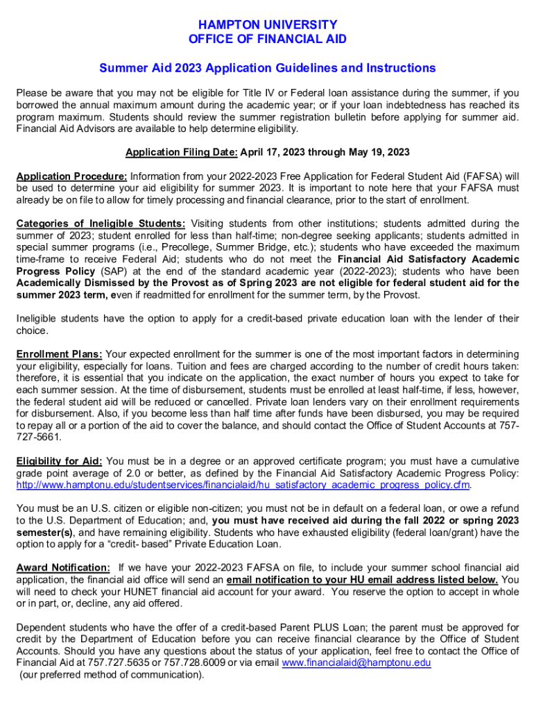 HAMPTON UNIVERSITY OFFICE OF FINANCIAL AID Summer Aid 2023 Application Guidelines and Instructions Please be aware that you may not be eligible for Title IV or Federal loan assistance during the summer,