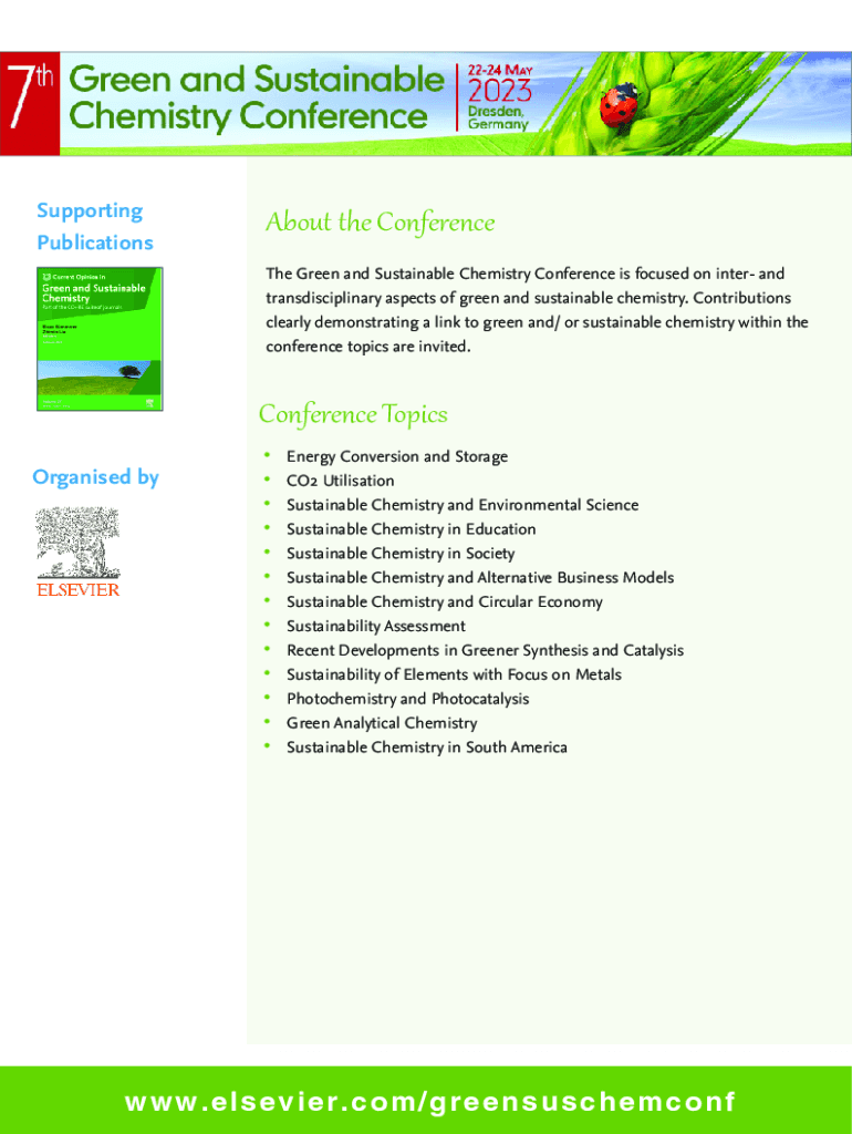 Supporting PublicationsAbout the Conference The Green and Sustainable Chemistry Conference is focused on inter and transdisciplinary aspects of green and sustainable chemistry. Contributions clearly