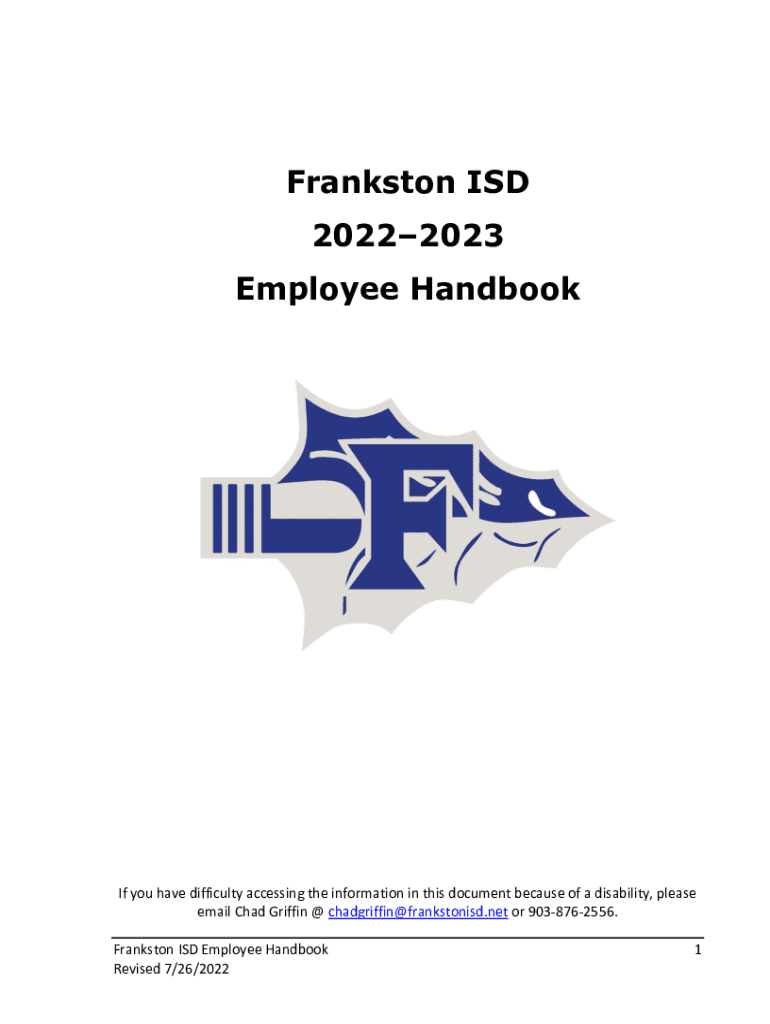 Franks ton ISD 20222023 Employee Handbook you have difficulty accessing the information in this document because of a disability, please email Chad Griffin @ chadgriffin@frankstonisd.net or 9038762556.