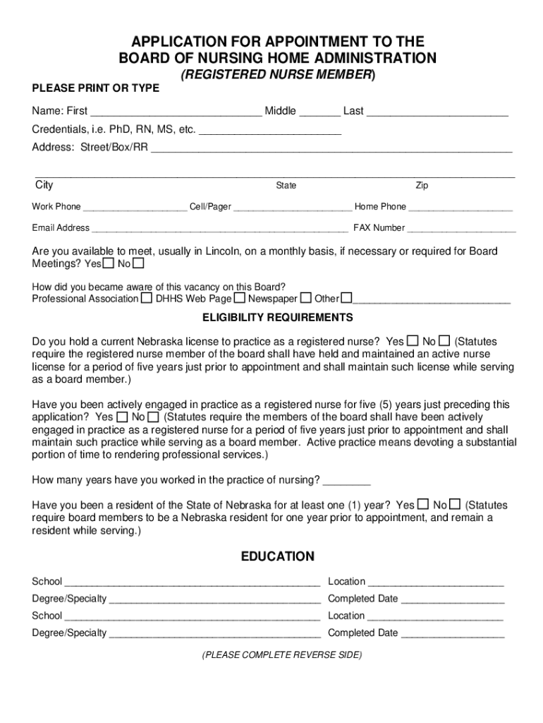 APPLICATION FOR APPOINTMENT TO THE BOARD OF NURSING HOME ADMINISTRATION (REGISTERED NURSE MEMBER) PLEASE PRINT OR TYPE Name: First ___ Middle ___ Last ___ Credentials, i.e. PhD, RN, MS, etc. ___ Address: