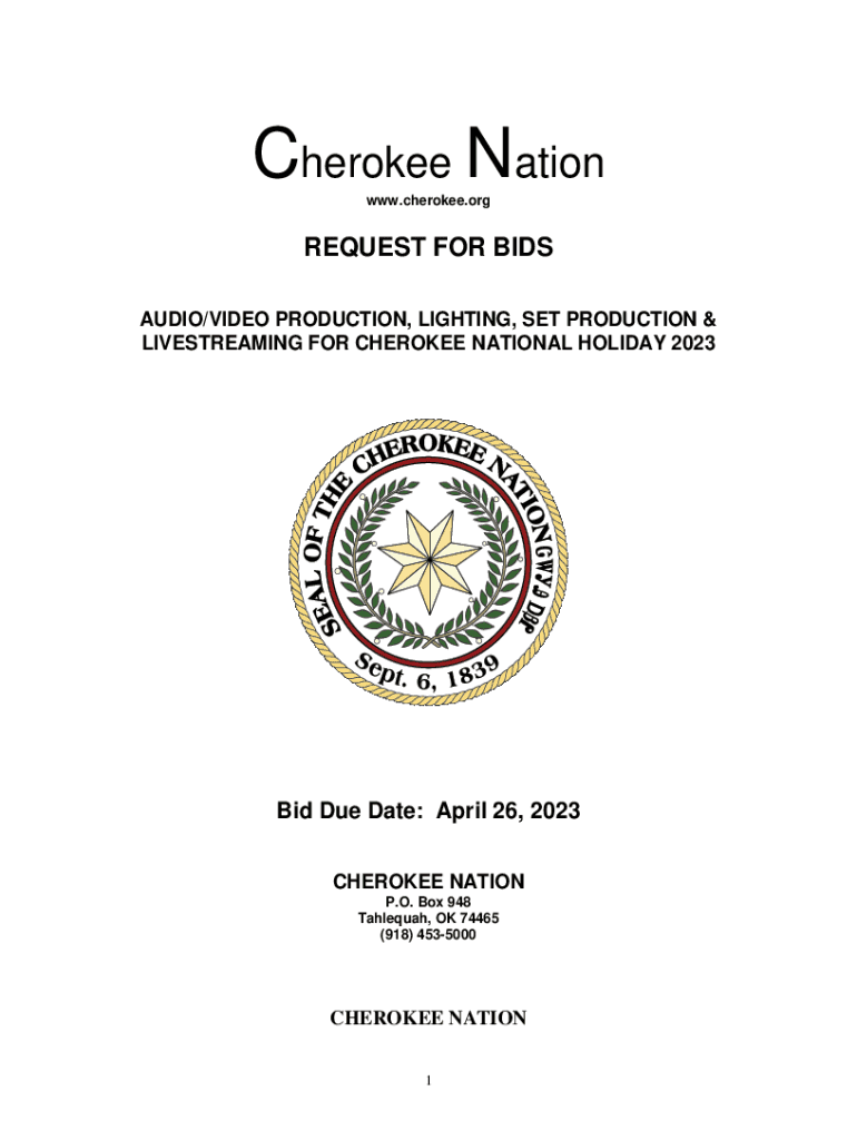 Cherokee Nation www.cherokee.orgREQUEST FOR BIDS AUDIO/VIDEO PRODUCTION, LIGHTING, SET PRODUCTION & LIVESTREAMING FOR CHEROKEE NATIONAL HOLIDAY 2023Bid Due Date: April 26, 2023, CHEROKEE NATION P.O.