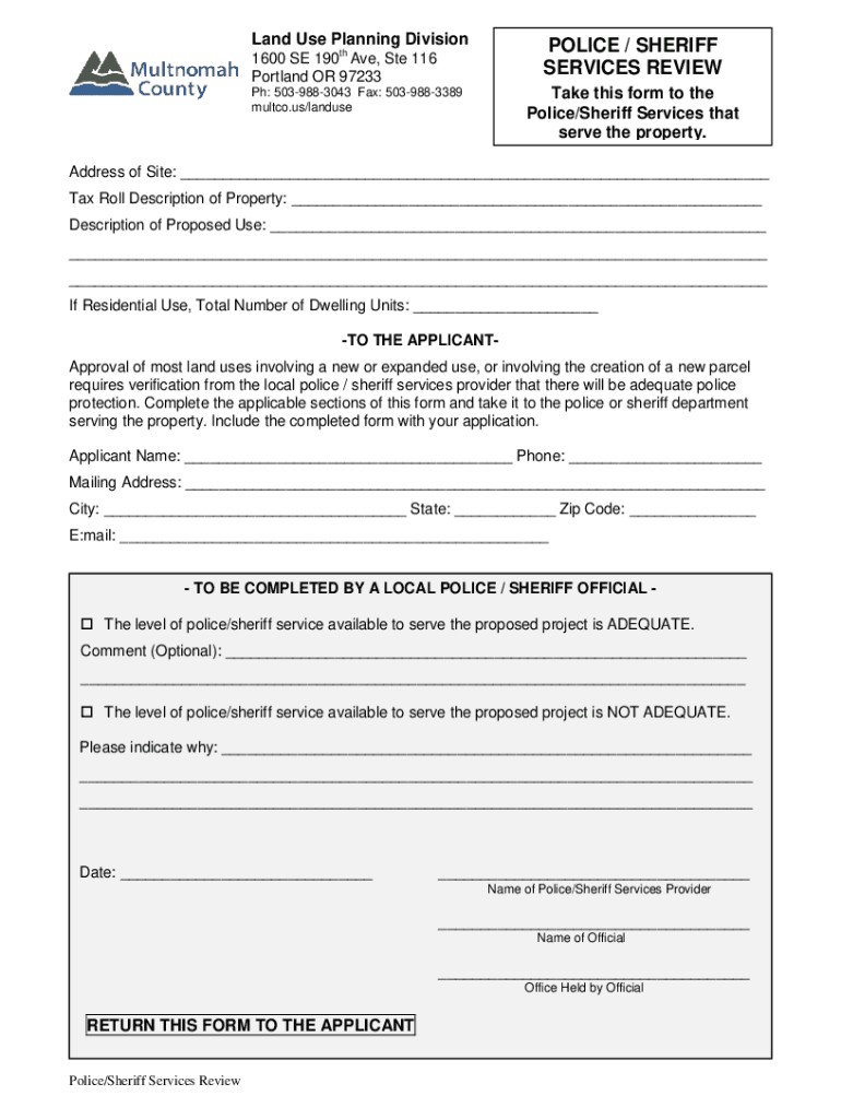 Land Use Planning DivisionPOLICE / SHERIFF SERVICES REVIEW1600 SE 190th Ave, Ste 116 Portland OR 97233Take this form to the Police/Sheriff Services that serve the property. PH: 5039883043 Fax: 5039883389